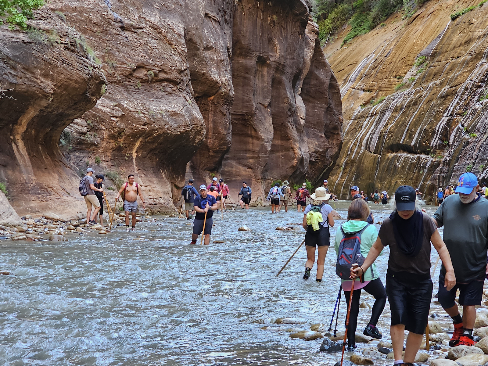 Based on how few got off the bus until the last stop, you could tell this would be crowded. A few were just walking the canyon. But, most were carrying wooden walking sticks. You can actually rent them for $5 a day at numerous places outside the park.