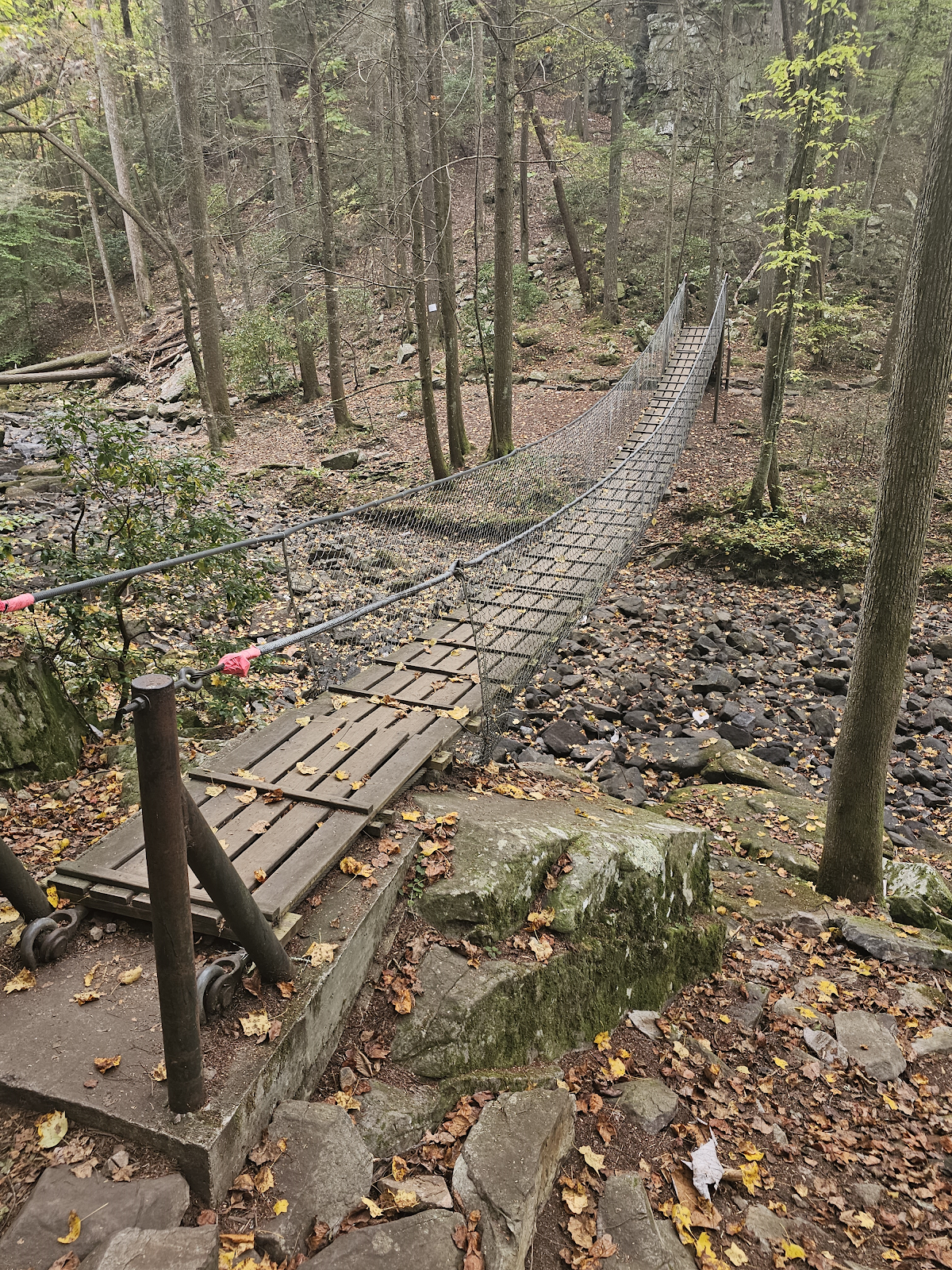 As you approach the overlook, the walkway splits. To the right is a rock bridge. To the left, a bouncy swing bridge. You know which one I was taking.